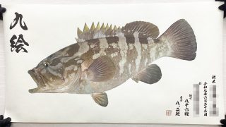 デジタル魚拓作品紹介 【デジタル魚拓作品紹介】カラー魚拓 クエ 86㎝ 【バージョン】カラー魚拓 【魚種】クエ 86㎝ 【用紙】A1ロング(縦594mm×横1100mm) 【背景】古紙風 【文字】毛筆太字 縦書き 『いや、本当にすごいです!ご依頼主様方の凄腕に感服いたします。』 2025.10.17 デジタル魚拓作品紹介
