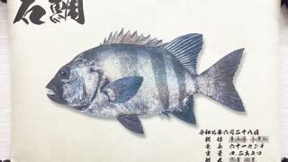 デジタル魚拓作品紹介 【デジタル魚拓作品紹介】カラー魚拓 石鯛 61㎝ 【バージョン】カラー魚拓 【魚種】石鯛 61㎝ 【用紙】A1サイズ(縦594mm×横841mm) 【背景】古紙風 【文字】毛筆太字 横書き 『目を釣りてたてのように加工してほしいとのご依頼もいただきました。』 2025.10.12 デジタル魚拓作品紹介