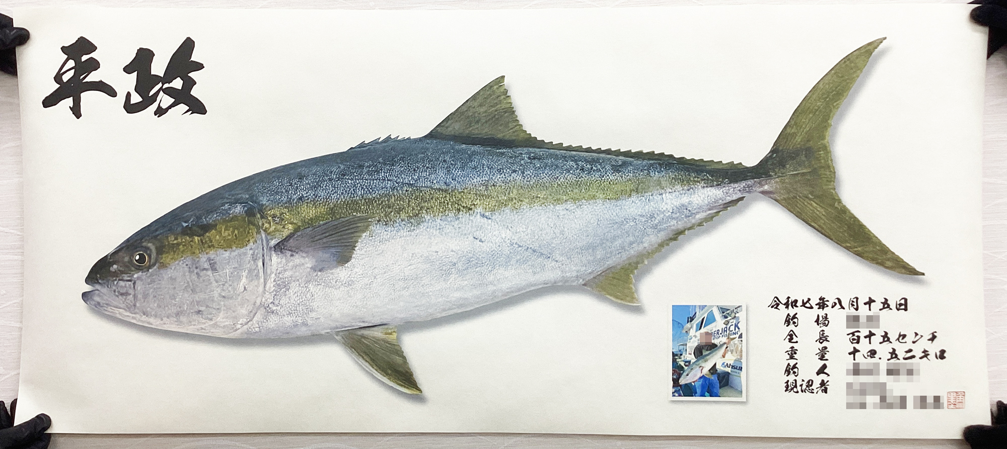リアル魚拓に釣果の記念写真を入れる形で制作させていただきました。