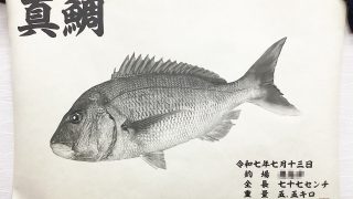 デジタル魚拓作品紹介 【デジタル魚拓作品紹介】墨魚拓 真鯛 77㎝ 【バージョン】墨魚拓 【魚種】真鯛 77㎝ 【用紙】B1サイズ(縦728mm×横1030mm) 【背景】古紙風 【文字】極太楷書体 横書き 『おめで鯛!!の真鯛です。全長も語呂がよくて、ダブルでラッキーな釣果です(^^)/』 2025.10.15 デジタル魚拓作品紹介