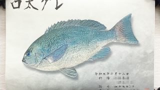 デジタル魚拓作品紹介 【デジタル魚拓作品紹介】リアル魚拓 口太グレ 47㎝ 【バージョン】リアル魚拓 【魚種】口太グレ 47㎝ 【用紙】A2サイズ(縦420mm×横594mm) 【背景】グレー 【文字】毛筆細字 横書き 『こだわりの作品にするために作品の完成を待つか、早く手元に持ちたいか、苦渋の選択でしたね!』 2025.09.26 デジタル魚拓作品紹介